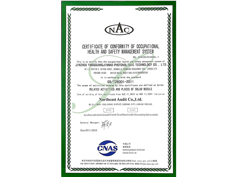 職業健康安全管理体系認証証明書(中国語)