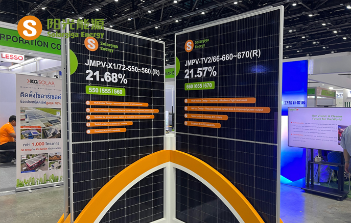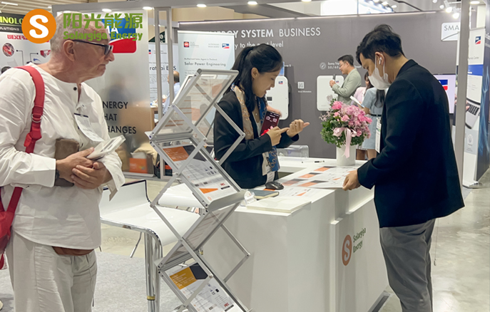本届展会,阳光能源带来了1款N型组件和3款P型组件产品,现场工作人员向来访客户及观众详细介绍了我司组件产品在不同场景下的实际应用,涵盖大型地面电站、工商业和住宅屋顶等领域。值得一提的是,本届展会展出的Giga-N系列组件基于182mm硅片,采用N型TOPCon电池技术并叠加双面技术,能够为终端用户带来更高的收益率;此外,该款组件边框采用聚氨酯材质,兼具优异的力学性能和耐盐雾、耐化学腐蚀性能,能够应对像泰国这种高湿高温气候的地区,更坚固、更安全、更可靠。