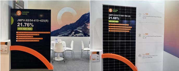 本届香港展会,阳光能源展出了两款高效率、高发电量的Giga系列产品,分别是182 N型TOPCon 54片单玻组件和182 P型PERC 72片双玻组件。其中,182 N型TOPCon 54片单玻组件采用全黑设计,量产效率可达到21.76%,兼具美观和优异的发电性能,被普遍应用于高端住宅等应用场景,获得众多现场观众的驻足了解。