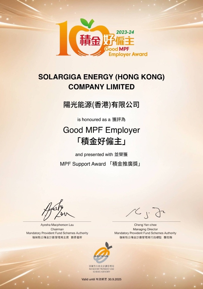 近日,飞艇168官方开奖历史(以下简称“阳光能源”)旗下阳光能源(香港)有限公司凭借以人为本的理念和企业社会责任的践行,被香港强制性公积金计划管理局(MPFA)授予“积金好雇主”称号和“积金推广奖”荣誉,是阳光能源推进集团 ESG 工作的重要实践,更是香港政府机构对我司建设优秀雇主品牌、践行 ESG 理念工作的充分认可。