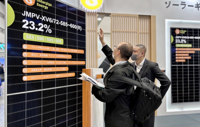 本次展会,阳光能源集中展示了公司的前沿技术和先进的光伏组件产品,5 款展品高度契合以小型项目为主导的日本光伏市场需求。其中一款 Giga-N 系列 48 片轻质双玻户用光伏组件,采用了 N型TOPCon 电池技术搭载 210R 矩形硅片,极大地提升了发电效率,组件转换效率提升到 23.0% ,即便在弱光环境下也能高效运作;在外观设计方面,打造更加简约时尚的全黑外观,适用于各类建筑风格。