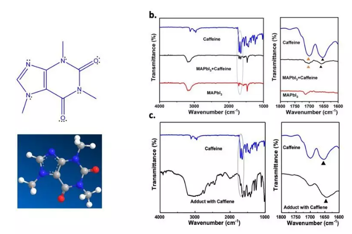 杨阳研究小组用加热的方法将咖啡因添加到40个太阳能电池的钙钛矿层中,并使用红外吸收光谱来确定咖啡因是否成功地与钙钛矿结合了。他们发现了咖啡因在与钙钛矿结合后,咖啡因中的羰基的特征峰发生了移动,这意味着咖啡因已经成功与钙钛矿结合了。