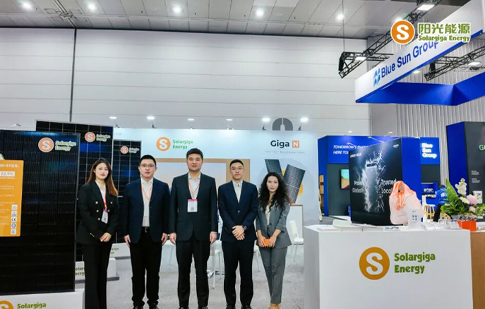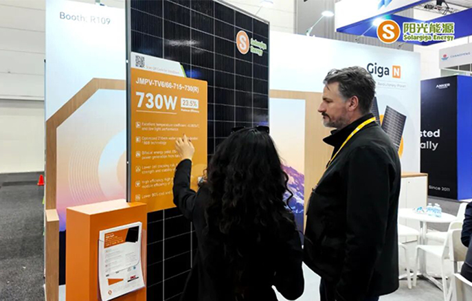 另一款明星产品——Giga-N 系列瓷白组件,凭借其 730W 的高功率和 23.5% 的转换效率,体现了阳光能源在光伏技术研发方面的扎实积累,获得了现场观众的广泛关注;其 18BB 多主栅设计有效降低了内部损耗,结合 -0.280%/℃ 的优异温度系数与强大的抗 PID 性能,确保了在高温等严苛环境下的发电稳定性和长期可靠性,为关注发电效益的用户提供了一个高性能的选择方案。