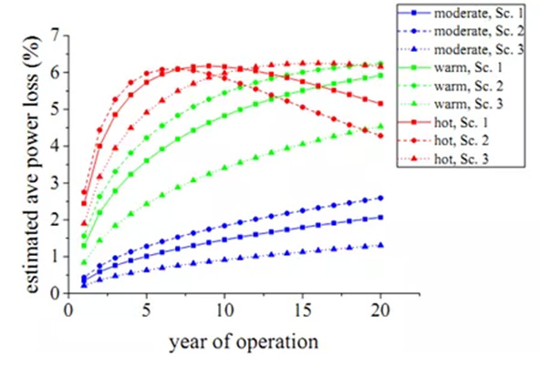结果如图所示,在炎热地带,年发电损失约达到5%,当达到最大衰减以后,第7年以后组件在热辅助的作用下开始功率恢复,但是恢复的程度有限,需要花费的时间也很长,如图则需要10年以上。在温暖地区,第5年功率衰减达到4%左右。在中性气候地区,影响较小。