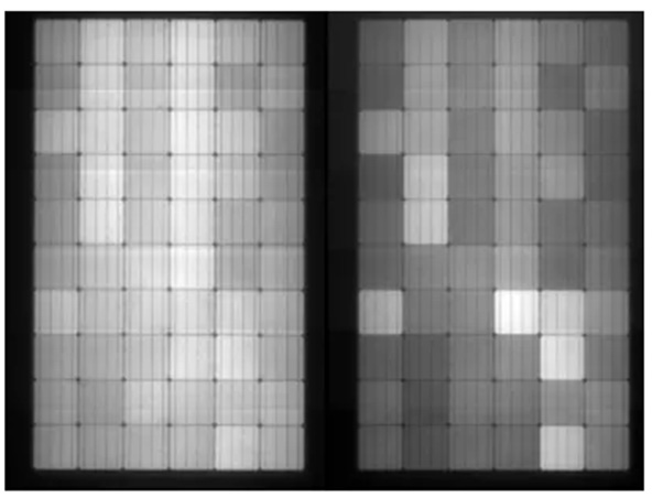 2019年9月,Fraunhofer 实验室MatthiasPander团队公开发表了《Prediction of potential power/field lossfrom LeTID susceptible modules》,论文对LeTID组件的功率衰减进行了详细的研究,如下图为经过690h测试后的单晶PERC组件EL照片,组件内部的电池亮度均匀性变差,部分电池已经呈现性能衰减。