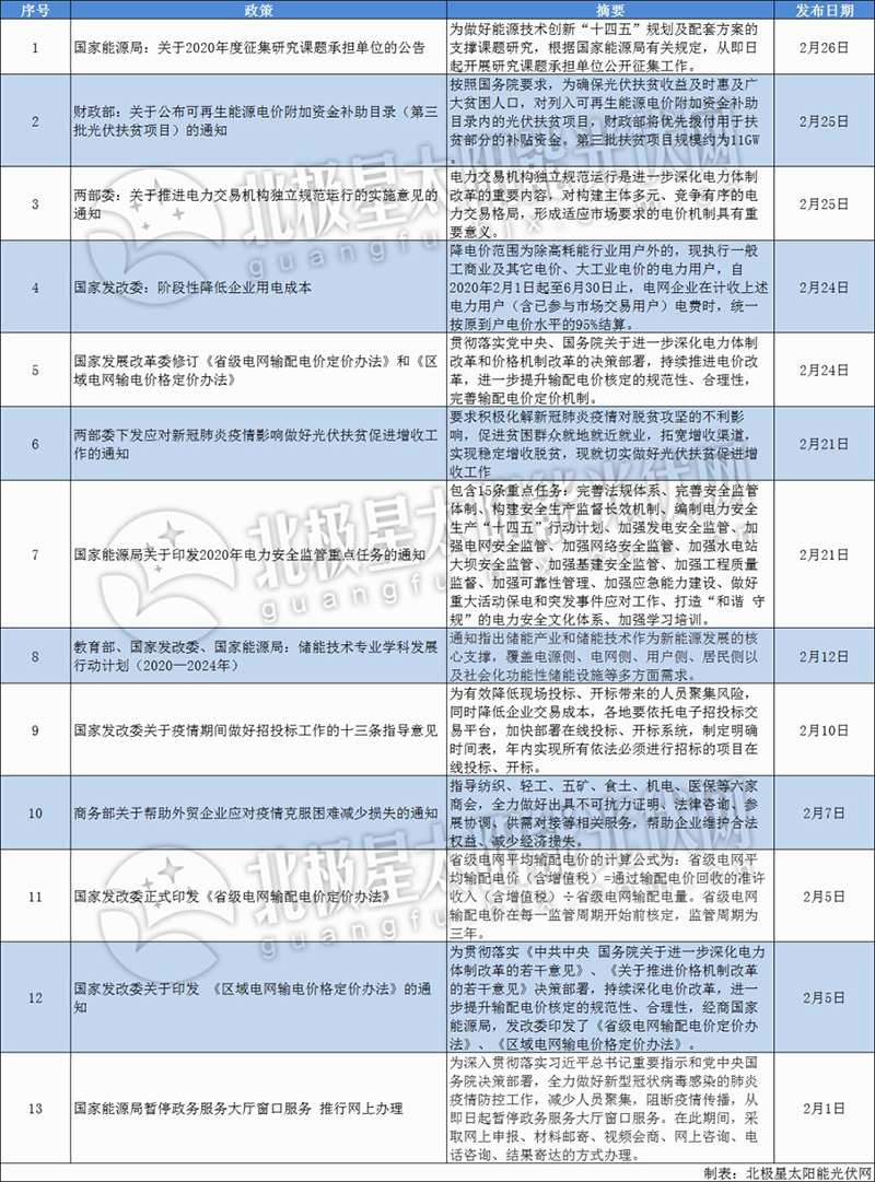由此,北极星太阳能光伏网梳理了2月光伏政策,其中国家层面共出台13项,涉及光伏扶贫、电力交易、电力安全等;地方层面共21项,涉及平价上网、光伏补贴、分布式光伏、BIPV等多个方面。