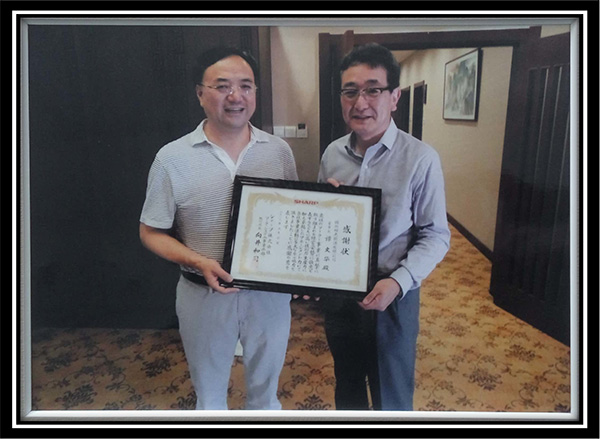 2013年9月,向井和司先生(右:夏普能源事业部本部长)为感谢阳光能源对夏普的支持和帮助,授予谭文华先生(左:锦州阳光能源董事长)感谢信。