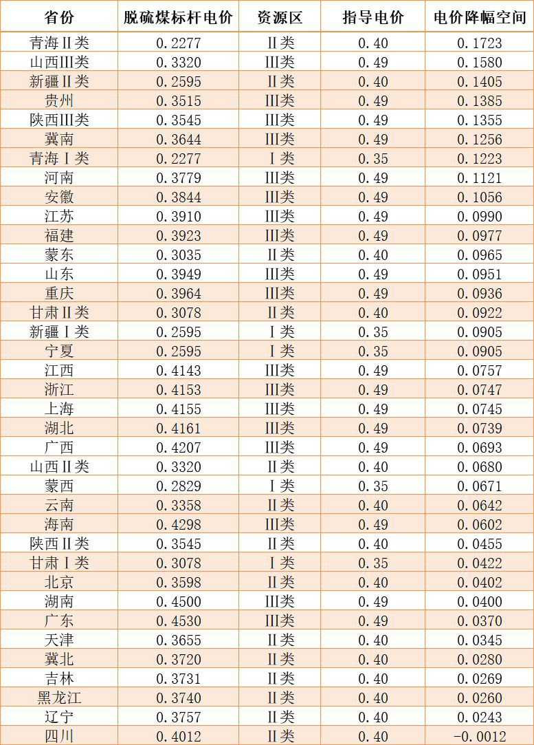 從電價降幅空間來看,青海、新疆二類、山西三類、貴州、陝西、冀南、河南、安徽等地降價幅度均可超過0.1元/千瓦時,相對競價優勢更為明顯一些。但以四川、冀北、湖南、廣東以及東三省為代表的地區,電價降幅空間僅有2-3分/千瓦時左右。具體數據見下表: